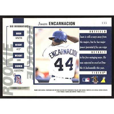 This is a 1997 Select Juan Encarnacion baseball card. The card is #133 and pictures show condition.