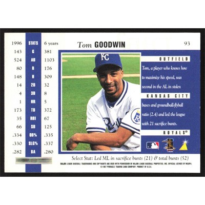 This is a 1997 Select Tom Goodwin baseball card. The card is #93 and pictures show condition.