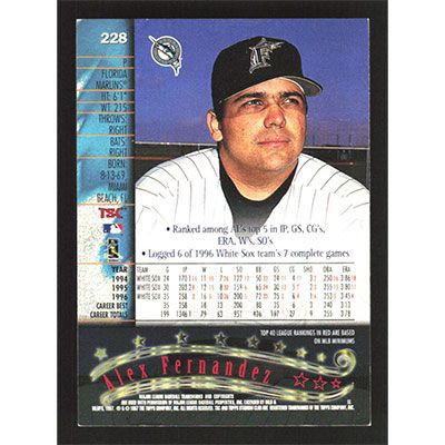 This is a 1997 Stadium Club Alex Fernandez baseball card. The card is #228 and pictures show condition.