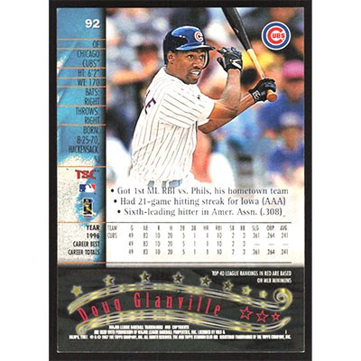 This is a 1997 Stadium Club Doug Glanville baseball card. The card is #92 and pictures show condition.