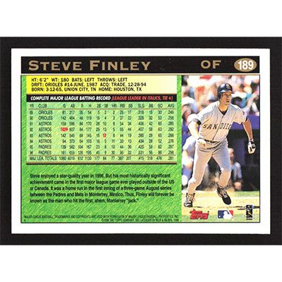 This is a 1997 Topps Steve Finley baseball card. The card is #189 and pictures show condition.