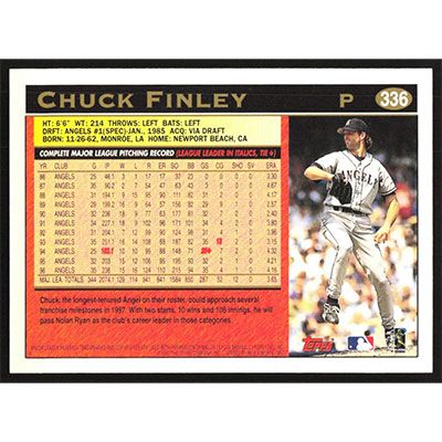 This is a 1997 Topps Chuck Finley baseball card. The card is #336 and pictures show condition.