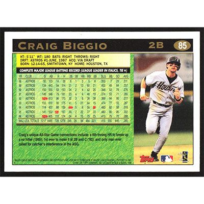 This is a 1997 Topps Craig Biggio baseball card. The card is #85 and pictures show condition.