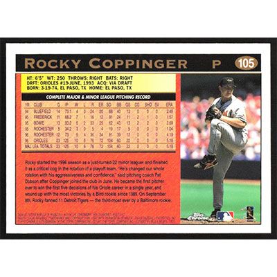 This is a 1997 Topps Chrome Rocky Coppinger baseball card. The card is #105 and pictures show condition.