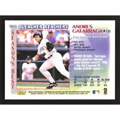 This is a 1997 Topps Season's Best Andres Galarraga Bleacher Reachers baseball card. The card is #SB10 and pictures show condition. Team(s): Colorado Rockies