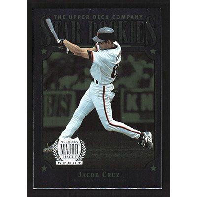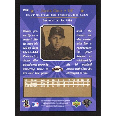 This is a 1997 Upper Deck Jacob Cruz Star Rookies baseball card. The card is #232 and pictures show condition.