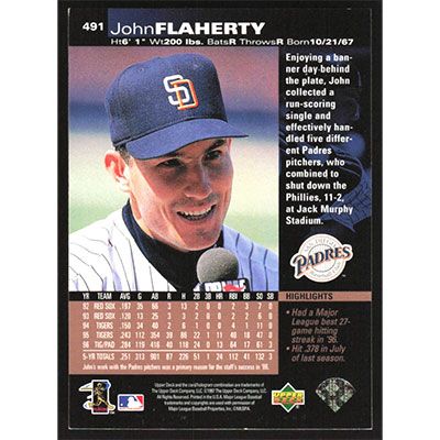 This is a 1997 Upper Deck John Flaherty baseball card. The card is #491 and pictures show condition.