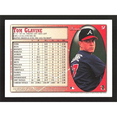 This is a 1998 Bowman Tom Glavine baseball card. The card is #57 and pictures show condition.