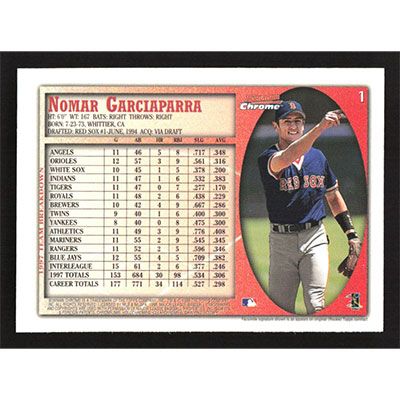 This is a 1998 Bowman Chrome Nomar Garciaparra baseball card. The card is #1 and pictures show condition.