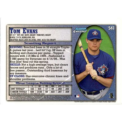 This is a 1998 Bowman Chrome Tom Evans baseball card. The card is #341 and pictures show condition.