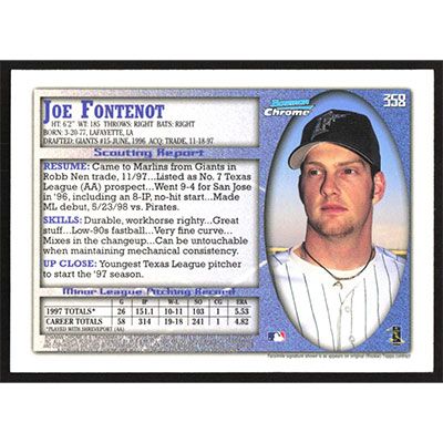 This is a 1998 Bowman Chrome Joe Fontenot baseball card. The card is #358 and pictures show condition.