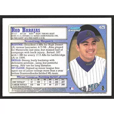This is a 1998 Bowman Chrome Rod Barajas baseball card. The card is #429 and pictures show condition.