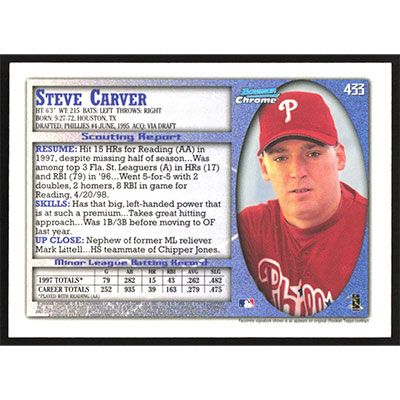 This is a 1998 Bowman Chrome Steve Carver baseball card. The card is #433 and pictures show condition. Team(s): Philadelphia Phillies Rookie Card (RC)
