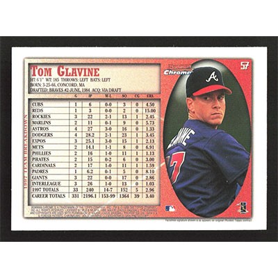 This is a 1998 Bowman Chrome Tom Glavine baseball card. The card is #57 and pictures show condition.