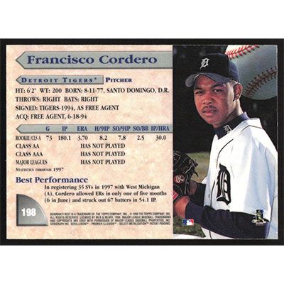 This is a 1998 Bowman's Best Francisco Cordero baseball card. The card is #198 and pictures show condition.
