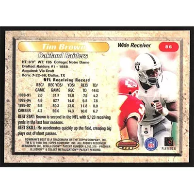 This is a 1998 Bowman's Best Tim Brown football card. The card is #86 and pictures show condition.