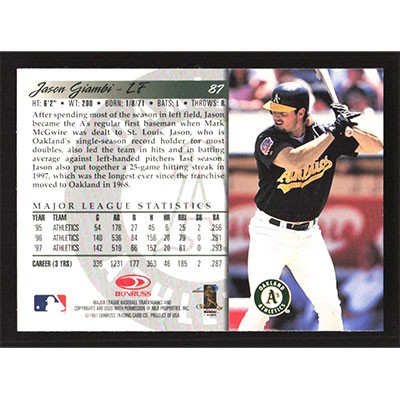 This is a 1998 Donruss Jason Giambi baseball card. The card is #87 and pictures show condition.