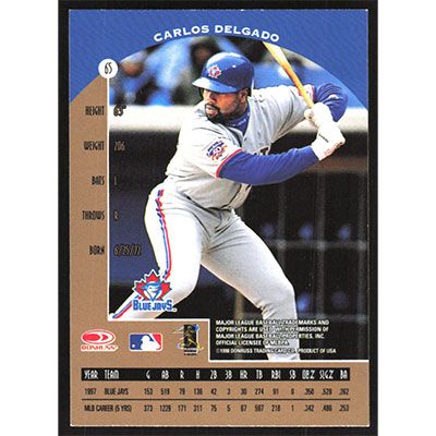 This is a 1998 Donruss Preferred Carlos Delgado Grandstand baseball card. The card is #65 and pictures show condition.