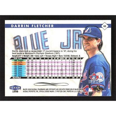 This is a 1998 Fleer Tradition Darrin Fletcher baseball card. The card is #63 and pictures show condition.