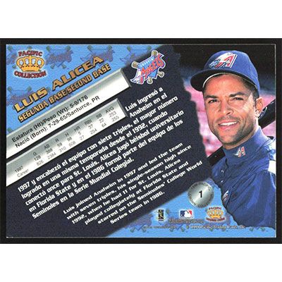 This is a 1998 Pacific Luis Alicea baseball card. The card is #1 and pictures show condition.