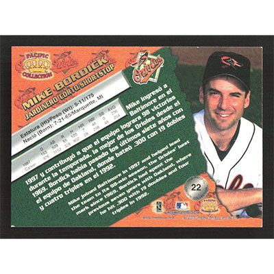 This is a 1998 Pacific Mike Bordick baseball card. The card is #22 and pictures show condition.