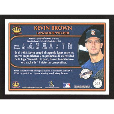 This is a 1998 Pacific Crown Collection Kevin Brown baseball card. The card is #238 and pictures show condition.