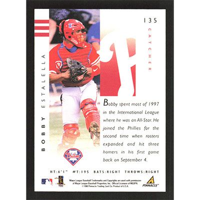This is a 1998 Pinnacle Performers Bobby Estalella baseball card. The card is #135 and pictures show condition.