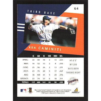 This is a 1998 Pinnacle Performers Ken Caminiti baseball card. The card is #64 and pictures show condition.