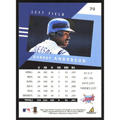 This is a 1998 Pinnacle Performers Garret Anderson baseball card. The card is #70 and pictures show condition.