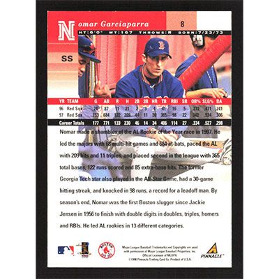 This is a 1998 Pinnacle Plus Nomar Garciaparra baseball card. The card is #8 and pictures show condition.
