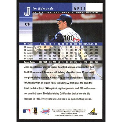 This is a 1998 Pinnacle Plus Gold Artist's Proofs Jim Edmonds baseball card. The card is #AP52 and pictures show condition. This card is limited; #'d 012/100.