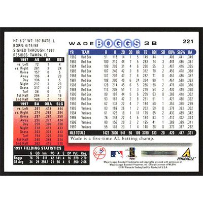 This is a 1998 Score Wade Boggs baseball card. The card is #221 and pictures show condition.