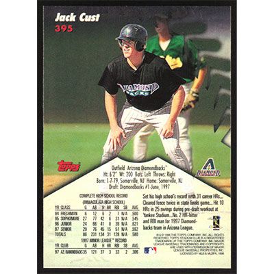 This is a 1998 Stadium Club Jack Cust baseball card. The card is #395 and pictures show condition.
