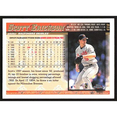 This is a 1998 Topps Chrome Scott Erickson baseball card. The card is #416 and pictures show condition.