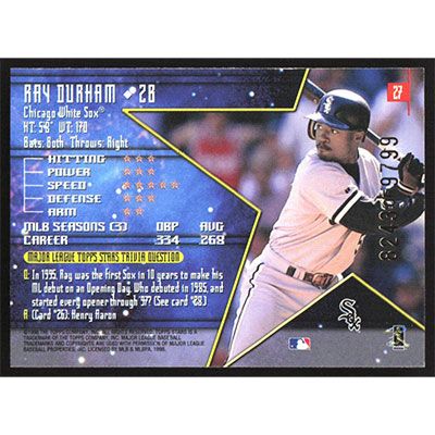 This is a 1998 Topps Stars Ray Durham baseball card. The card is #27 and pictures show condition. This card is limited; #'d 8243/9799. Team(s): Chicago White Sox