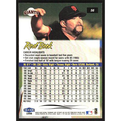 This is a 1998 Ultra Rod Beck baseball card. The card is #56 and pictures show condition.