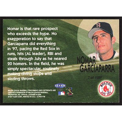 This is a 1998 Ultra Back to the Future Nomar Garciaparra baseball card. The card is #7 and pictures show condition.