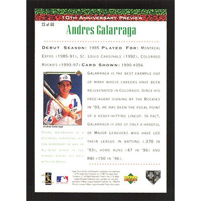 This is a 1998 Upper Deck 10th Anniversary Preview Andres Galarraga baseball card. The card is #23 and pictures show condition.