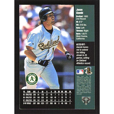 This is a 1998 Upper Deck Jason Giambi baseball card. The card is #183 and pictures show condition.
