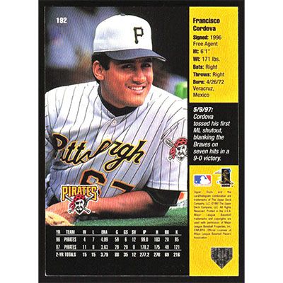 This is a 1998 Upper Deck Francisco Cordova baseball card. The card is #192 and pictures show condition.