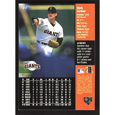 This is a 1998 Upper Deck Mark Gardner baseball card. The card is #217 and pictures show condition.