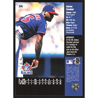 This is a 1998 Upper Deck Kelvim Escobar baseball card. The card is #239 and pictures show condition.