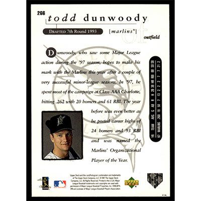This is a 1998 Upper Deck Todd Dunwoody Star Rookie baseball card. The card is #266 and pictures show condition.
