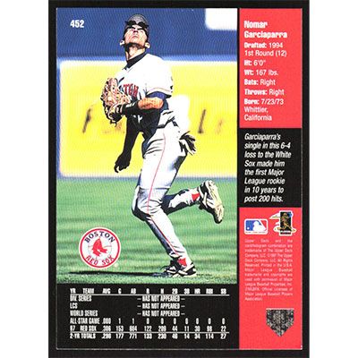 This is a 1998 Upper Deck Nomar Garciaparra Upper Echelon baseball card. The card is #452 and pictures show condition.