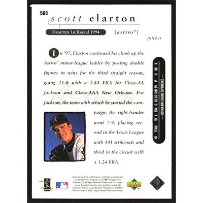 This is a 1998 Upper Deck Scott Elarton Star Rookie baseball card. The card is #569 and pictures show condition.