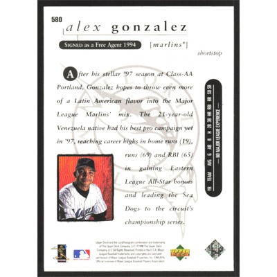 This is a 1998 Upper Deck Alex Gonzalez Star Rookie baseball card. The card is #580 and pictures show condition.