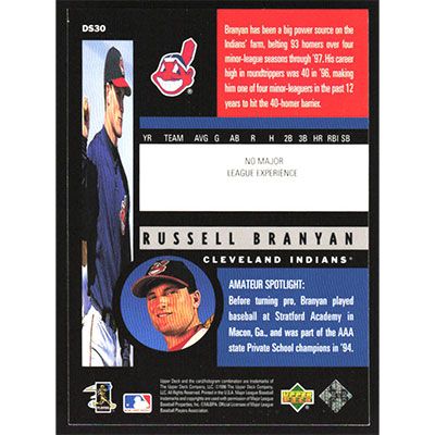 This is a 1998 Upper Deck Destination Stardom Russell Branyan baseball card. The card is #DS30 and pictures show condition.