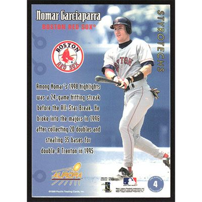 This is a 1999 Aurora Styrotechs Nomar Garciaparra baseball card. The card is #4 and pictures show condition.