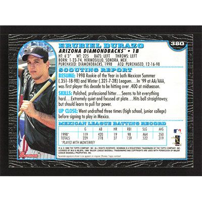 This is a 1999 Bowman Erubiel Durazo baseball card. The card is #380 and pictures show condition.