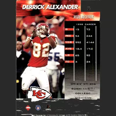 This is a 1999 Collector's Edge Fury Millennium Collection Derrick Alexander football card. The card is #5 and is in NM-MT condition.